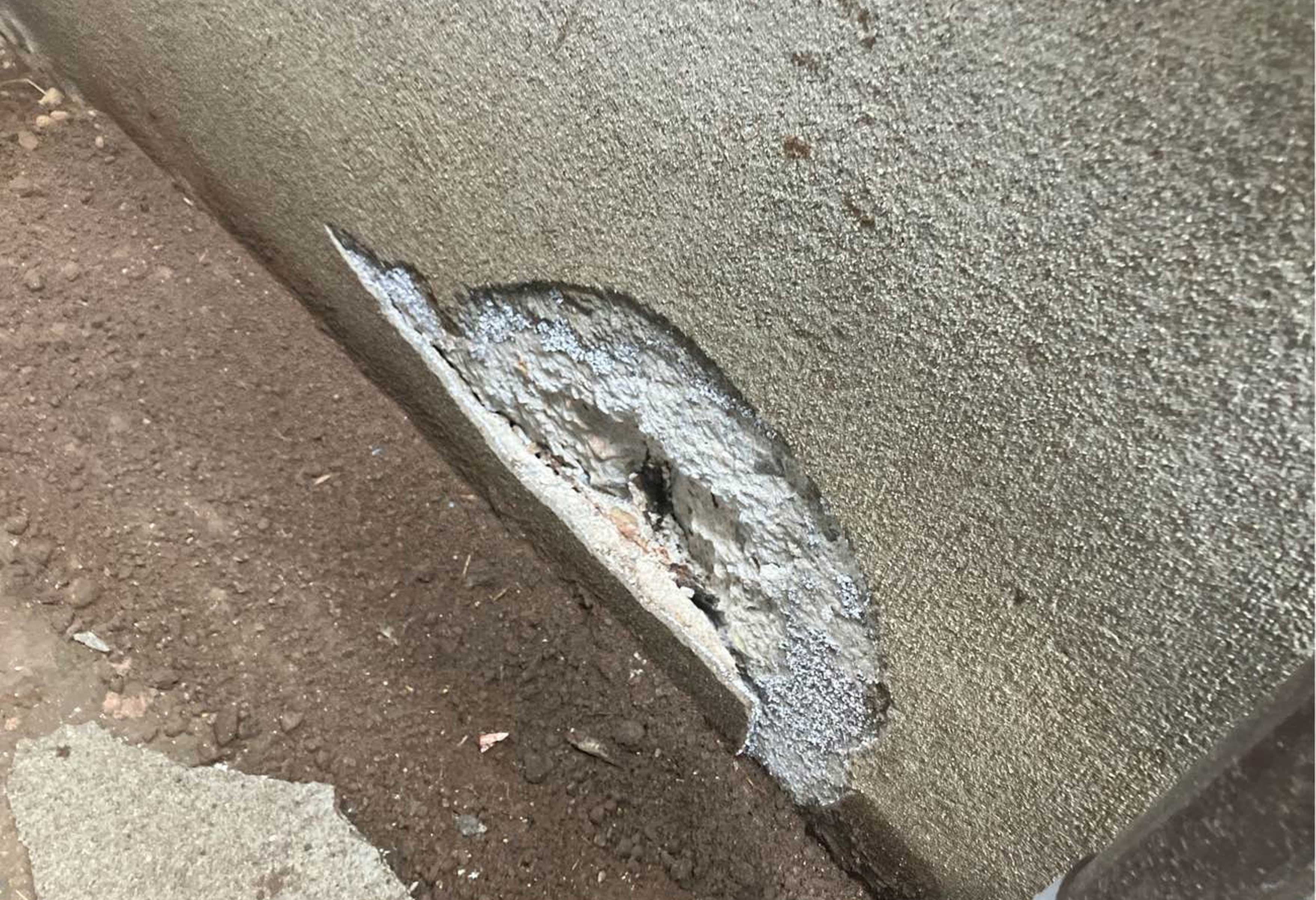 基礎表面の剥離とクラックが見られ、場所によっては鉄筋が見えていました。 進行性のあるひび割れは雨水の侵入路となるため、早期の補修が重要です。