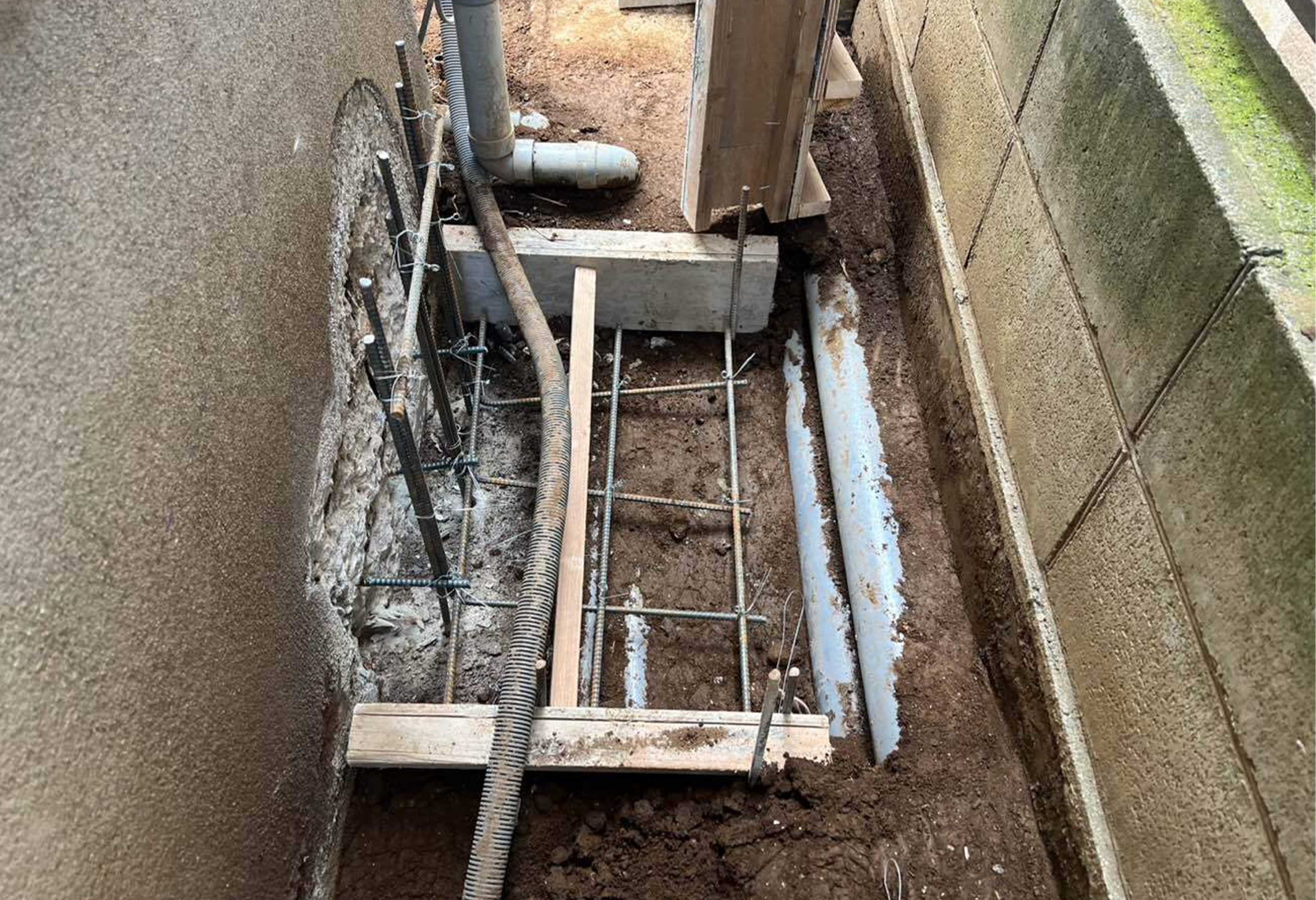 松戸市にお住まいのY様邸で、住宅の基礎補強工事を行いました。地震や経年劣化の影響により コンクリートが割れて一部で鉄筋が露出している状態でした。放置すると雨水の浸入や錆の進行で 耐久性が低下するため、既存基礎に補強アンカーを打ち込み、型枠を組んで新しいコンクリートを 増し打ちして新旧を一体化させました。