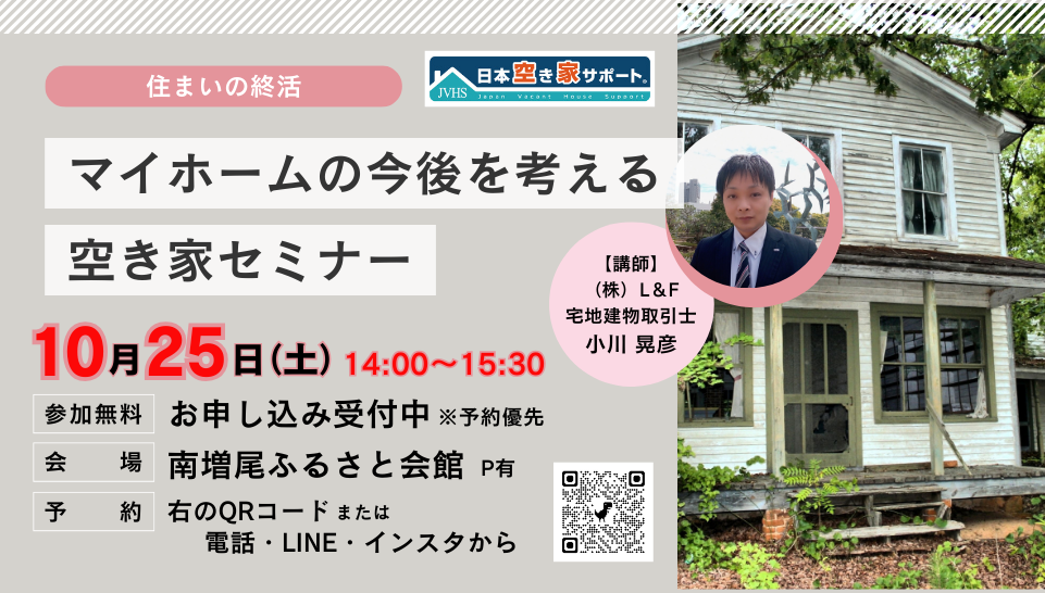概要 | ■このセミナーでわかること■ ・空き家にする前に行うべきこと ・自分で空き家を管理する際の注意点 ・空き家にかかる費用やリスク ・将来の相続に向けた「備え方」 ・空き家にまつわる法律や手続きに必要な知識 --------------------------------------------- ●参加費●無料 ●定 員●30名 (予約優先・空きがあれば当日参加OK) |