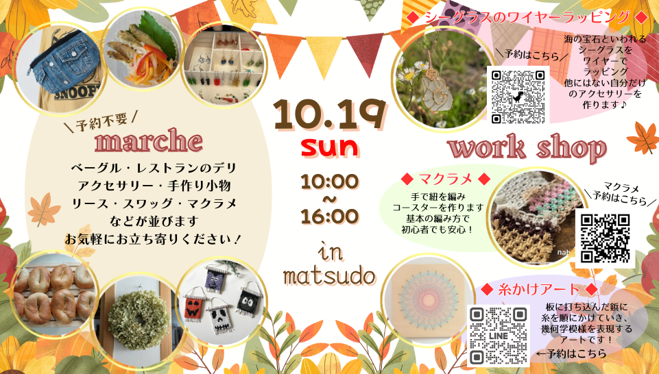 スケジュール | 【ワークショップ】 ①糸かけアート ¥2,000(1人)■講師・綾佳さん ●AM●10:00〜12:30(鋲打ち有り) 定員5名 ●PM●13:30〜15:30(鋲打ちなし) 定員5名 集中して糸をかけていくと、気持ちが落ち着いてきます。この機会にぜひ一度、体験してみませんか? ---------------------------------------------------- ②シーグラスでオリジナルペンダント作り ¥3,000(1人)■講師・Muuさん ●PM●13:00~15:00 定員4名 シーグラスをワイヤーでラッピングして、世界にひとつのオリジナルペンダントを作ります♪ ---------------------------------------------------- ③マクラメでコースター作り ¥1,500(1人)■講師・nahonoさん ●AM●10:00~11:30 定員4名 基本の編み方でコースターを作ります 初心者でも安心してご参加ください! ---------------------------------------------------- ※※①②③のワークショップご予約は 各QRコードよりお願いします※※ ---------------------------------------------------- ---------------------------------------------------- 【マルシェ】 ・こまいぬベーグル堂(ベーグル) ・レストランシェーヴル(カップデリ、サンドイッチなど) ・teshigoto3(ハンドメイドバック、ペンケースなど) ・ちのきのこ(手作りアクセサリー) ・ぷらねっとぐりーん(スワッグ、ナチュラルリース、鉢苗物、園芸相談など) ---------------------------------------------------- 【ほかのお楽しみ♪】 ・包丁研ぎ(1本100円) ・野菜の袋詰め ・ピアノライブ(ランチタイム) ・シェーヴルさんの淹たてコーヒー |