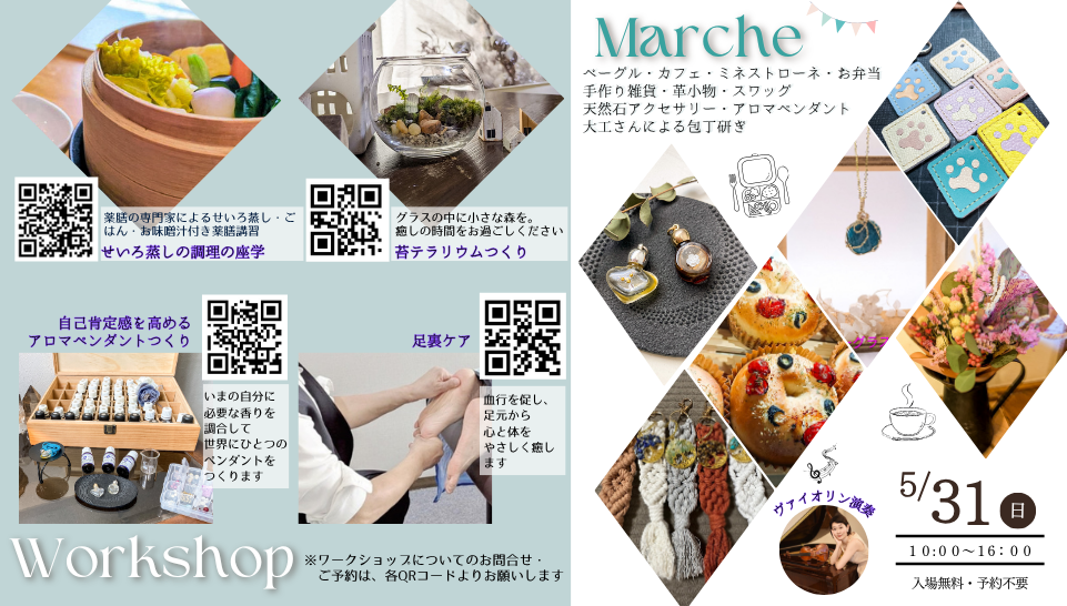 | スケジュール | ◇ マルシェ ◇ 【屋外エリア】(テント4台) ・こまいぬベーグル堂(国産小麦・天然酵母のベーグル) ・レストランシェーヴル(お弁当・お惣菜) ・ちのきのこ(ミネストローネスープ・茄子の煮びたし) ・ぷらねっとぐりーん(ナチュラルドライスワッグ/園芸相談) 【室内エリア】 ・Muu(天然石・シーグラスアクセサリー) ・こうのだい制作所(革小物) ・ありんくりん(手作り小物) ・愛樹(幸せを呼ぶアロマペンダント) ──────────── ◇ 特別企画 ◇ 【ランチタイム・ヴァイオリン生演奏】 時 間|12:00 – 13:00 場 所|1Fリビング 演奏者|鵜飼牧子さん 【包丁研ぎ】 場 所|駐車場 料 金|1本100円(1家庭2本まで) ──────────── ◇ ワークショップⅠ ◇ 【自己肯定感を高めるアロマペンダントつくり】 時 間|13:30 – 15:00 定 員|5名 参加費|2,800円(お一人様) 講 師|愛樹 植物の力を身につけられるアロマペンダント 今の自分に必要な香りを調合して世界にひとつの小瓶をつくります ──────────── ◇ ワークショップⅡ ◇ 【苔テラリウムつくり】 時 間|13:30 – 15:00 定 員|4名 参加費|3,500円(お一人様) 講 師|ぷらねっとぐりーんさん グラスの中に小さな森を。癒しの苔テラリウムつくり ──────────── ◇ ワークショップⅢ ◇ 【せいろ蒸しの調理の座学】 時 間|10:00 – 12:00 定 員|5名 参加費|4,000円(お一人様) 講 師|五十嵐 恵さん(管理栄養士・国際中医師・国際中医薬膳師) ★せいろ蒸し・ごはん・お味噌汁付き 身体の不調、もしかしたら体の巡りが原因かもしれません。薬膳で巡りの仕組みを学んでみませんか? ──────────── ◇ ワークショップⅣ ◇ 【足裏ケア】 時 間|10:00 ~/11:00~/13:00~/14:00~/15:00~ ※5枠 参加費|500円(お一人様20分) 講 師|やさしい風さん 中足骨の間の血管や筋肉などを刺激して、血行を促し、足元から心と体をやさしく癒します |