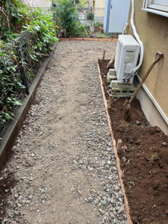 既存土を掘削し、地盤を締め固めたうえで砕石を敷設・転圧し、下地を安定させました。