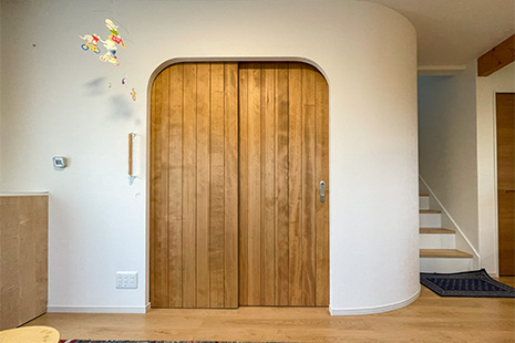 完成した住まいの中で、特に気に入っているのがRの壁と木製の引き戸です。やわらかな曲線と木の質感の組み合わせが美しく、来客のたびに「ここ、すごいね」「かわいいね」と声をかけられるそうです。