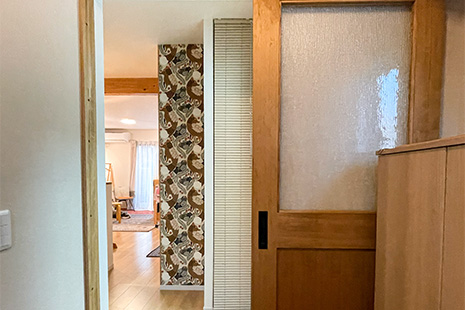 Rの壁と木製引き戸が印象的な一角。 来客時にも「かわいい」「すごいね」と声をかけられるお気に入りの場所です。