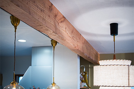 木の梁と照明が空間のアクセントに。 素材感を活かした、落ち着きのあるリビングです。